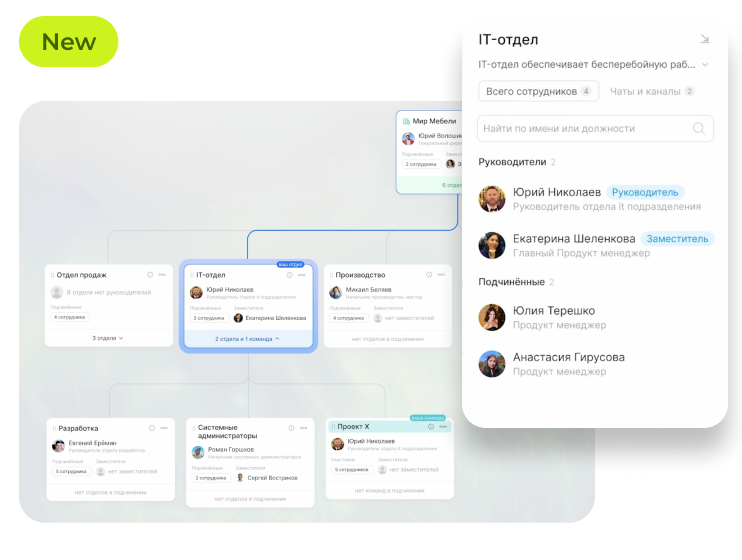 Специалист переводится в другой отдел — чат со старым коллективом закрывается, а новый создаётся автоматически. Руководителям больше не нужно вручную редактировать список участников — структура обновляется сама.