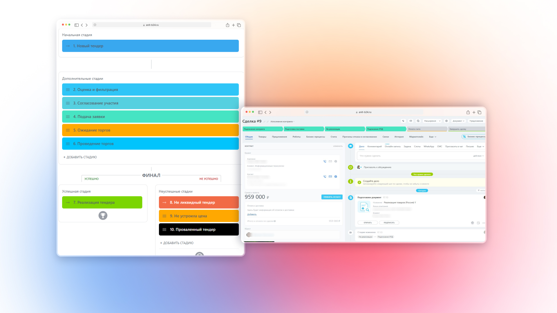 Мы учли, что работа не заканчивается победой в торгах, поэтому внедрили две связанные воронки: