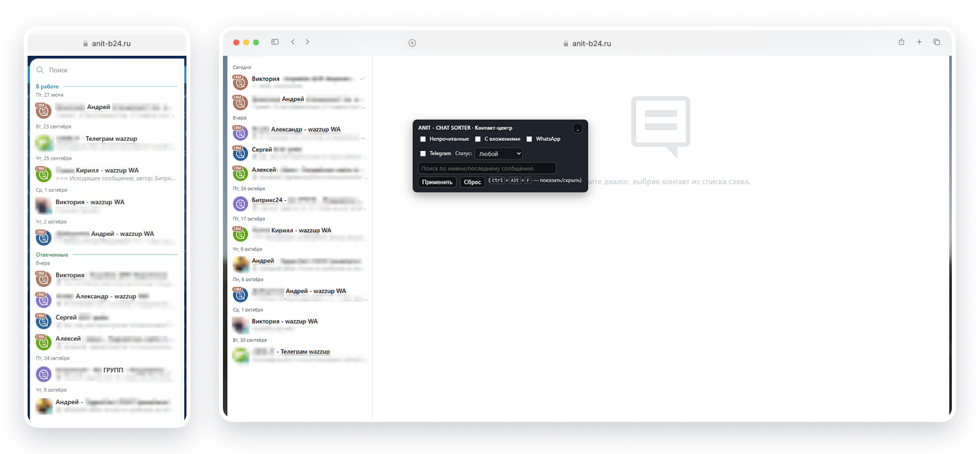 фильтровать диалоги по статусу, непрочитанным, вложениям, каналам (WhatsApp, Telegram);