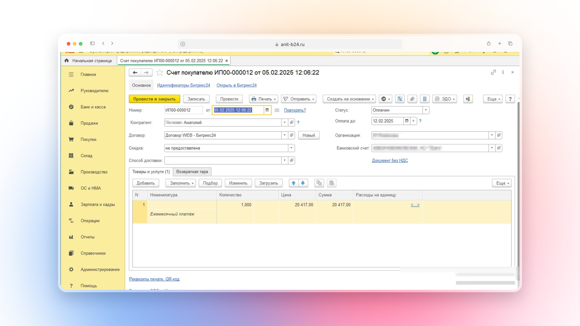 Мы отдельно реализовали интеграцию с 1С:Бухгалтерия. CRM передаёт клиентов и выставленные счета. В проекте мы применили типовую интеграцию, а для обработки сценариев автоплатежей и логики стадий разработали дополнительную PHP-обвязку.