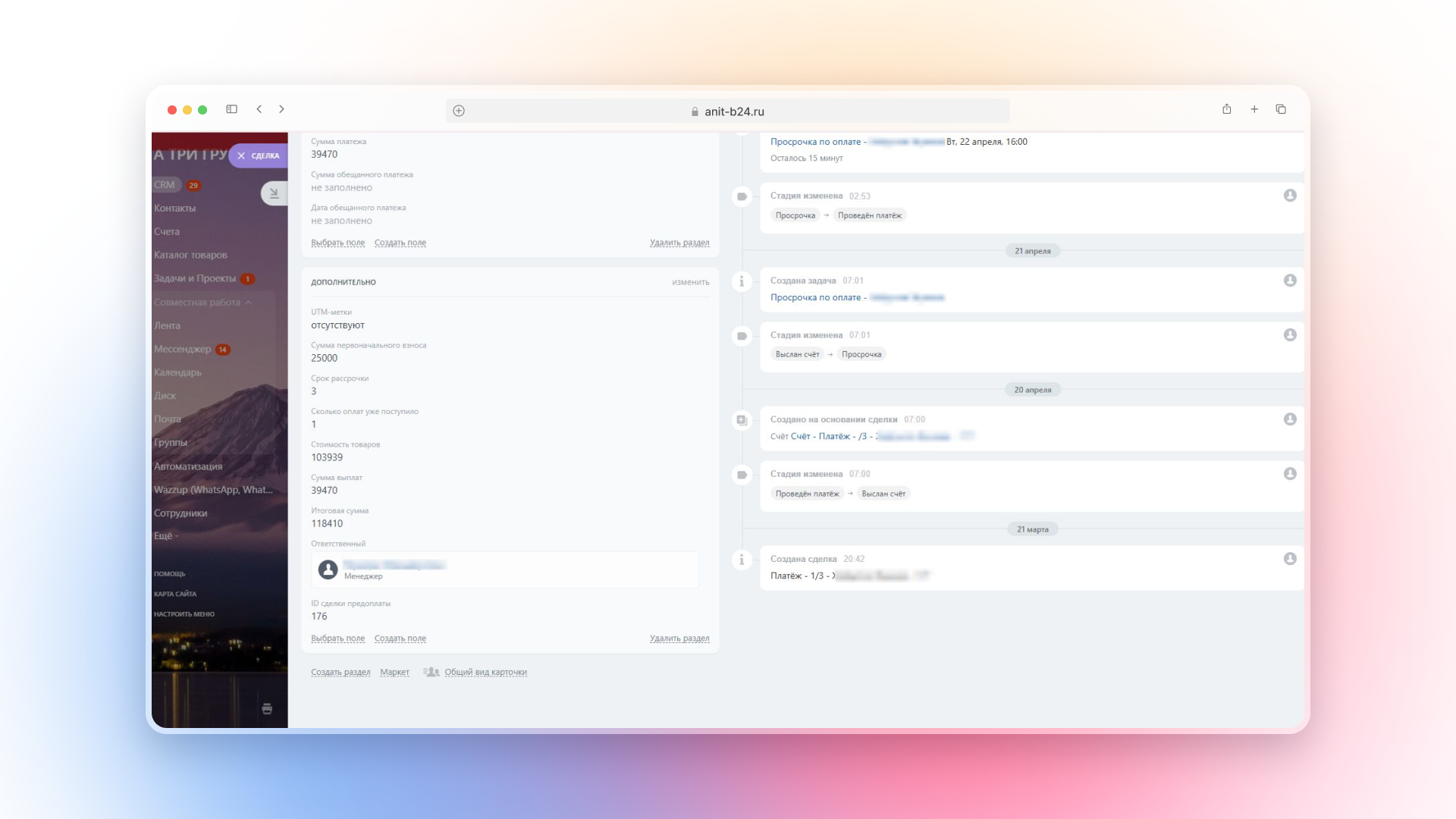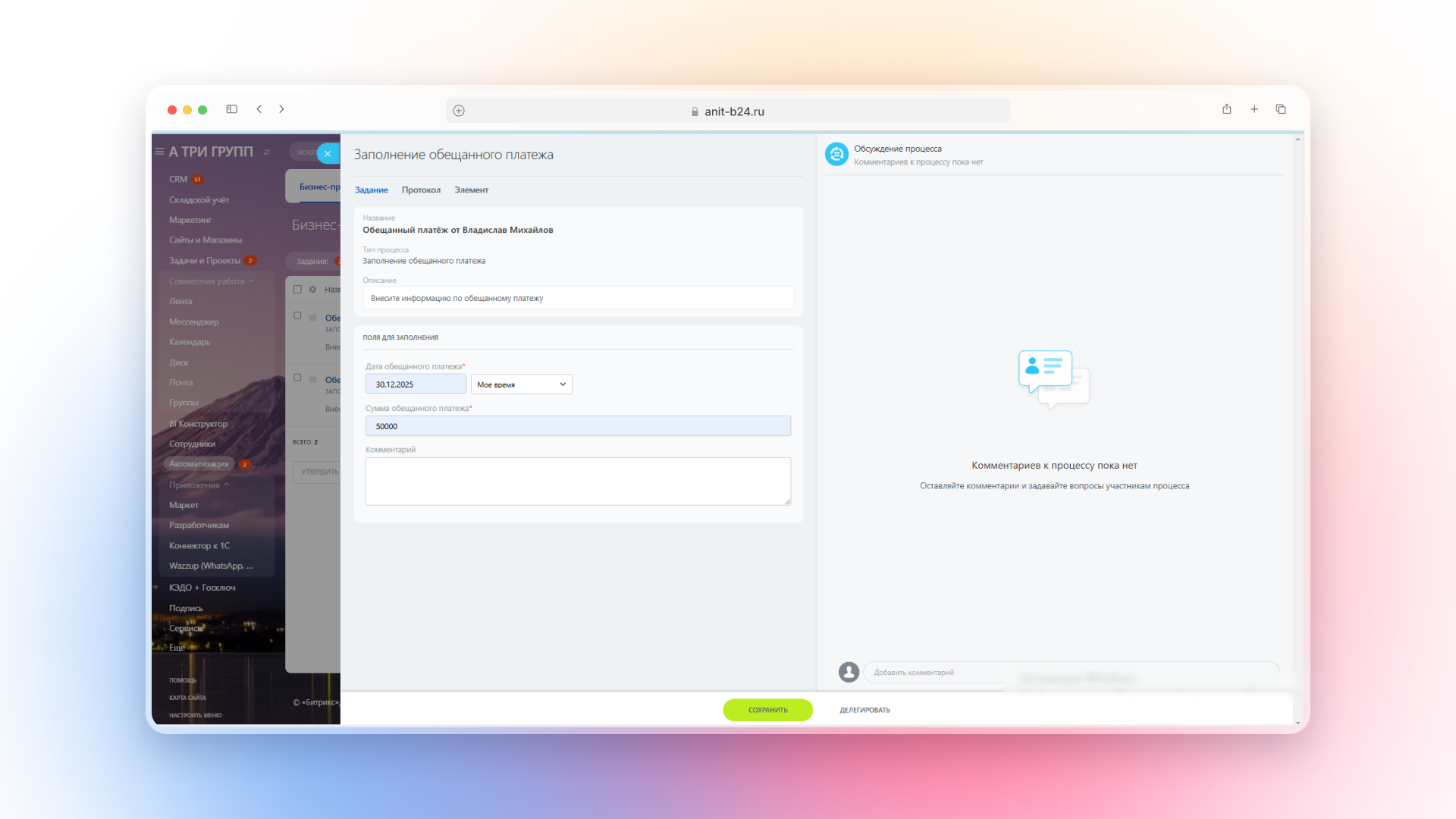 Для этого он получает ссылку на задание бизнес-процесса. Через него он вносит данные обещанного платежа: дату и сумму. Эти поля недоступны для редактирования в самой сделке — доступ к воронке автосписаний у менеджеров только на просмотр. Это сделано чтобы защитить чувствительную информацию и исключить случайные изменения.